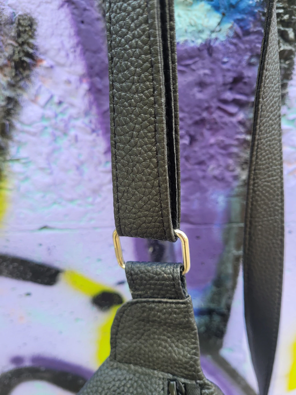 Medidas: 28 x 12 x || Riñonera confeccionada en ecocuero graneado || Tiene 2 bolsillos, cierres de color negro, herrajes metálicos y correa del mismo material que la riñonera.
